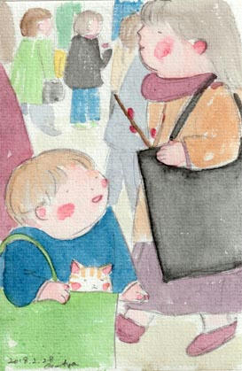 桃の花を小脇にしのばせたお姉さんとすれ違う